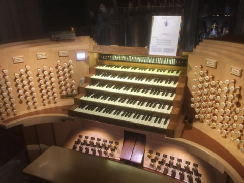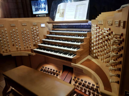 The first instrument is mentioned as early as 1357. In 1403, a new organ is built. Till 1730, there is a history of many transformations and extensions. 1730-1733 The present organ originates from a new organ constructed by François Thierry in 1730-33. This instrument was renovated and extended in 1783-88 by François-Henri Clicquot. 1864-68 The positive was taken away by Violet le Duc (it is still stored somewhere in the cathedral) and the Clicquot organ was transformed into a symphonic organ by Cavaillé-Coll. He introduced a novelty here by extending the harmonics using a 7th and its octaves. 1959 - 1968 The instrument was electrified , extended and revoiced par Jean Hermann and Robert Boisseau under the direction of Pierre Cochereau and lost its symphonic character. 1990-92 A large-scale restoration was carried out by Boisseau & Cattiaux, Emeriau, Giroud, returning the organ to its symphonic character of the 19th century, while maintaining the classical 32' grand choeur as reconstructed in the past century. Video: Point 'd Orgue 2012-2014 The organ was restorated again and enlarged by Bertrand Cattiaux and Pascal Quoirin. They installed a new computer traction, repaired the sunken pipes, cleaned the organ and modified the "small pedal" into a ‘resonnance’ board. A register system motorized by high-pressure pneumatic actuators was supplied to replace Cavaille- Coll's action stop ties and the pneumatic stop tie machines were completely restored. Video Montage and rénovation April 15, 2019 A very, very dark day in the history of Paris, France and the world: Notre-Dame-de-Paris is seriously damaged by a great fire. Thanks to the watertight and fireproof stone vault, the great organ did not suffer! The pipes were only filled with lead dust. 2019-2024 The windchests were cleaned at the Quirin workshop in Saint-Didier and restored by the Manufacture Languedocienne des Grandes Orgues in Lodève (Hérault). Spared by the fire but covered with soot and lead dust, the pipes have been completely renovated in the Cattiaux- Chevron workshop in Liourdres in Corrèze. After the completion of the restoration of the organ at the end of 2022, the reassembly of the instrument in the west gallery of the cathedral began in early 2023 and starting at the beginning of 2024, each of the 8,000 pipes (completely renovated by Cattiaux-Chevron) was voiced and tuned separately. The organ was inaugurated and blessed during the reopening of the cathedral on December 7, 2024. 33 stops are from before the revolution, around 50 are from Cavaillé-Coll.