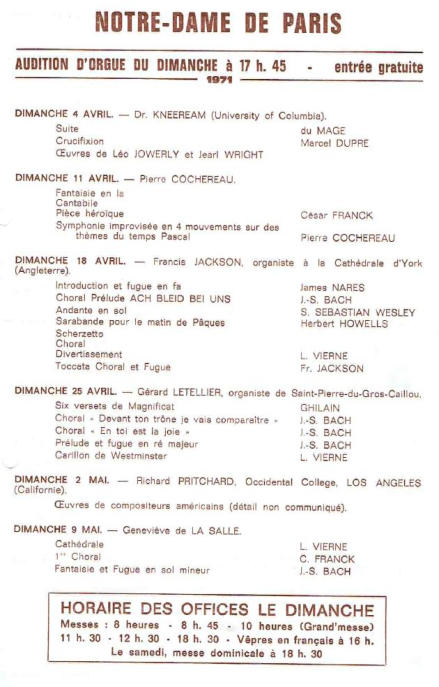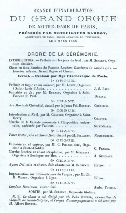 Maurice Duruflé: ... placed an a dais situated in the middle of a spacious organ loft with thé immense nave of the cathedral in het organist's view. Like a ship's captain on the bridge, he takes in the great open sea. It is an absolutely intoxicating experience. (L'Orgue, no 162, april-june 1977) Louis Vierne: At Notre Dame, with the console about seven feet out from the case, the player hears the sound directly and in all its power. It is a joy seldom experienced elsewhere.
